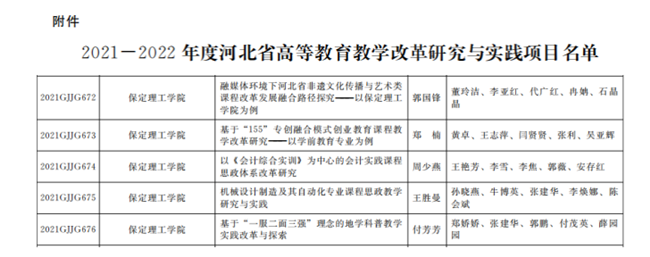 文章导读:近日,河北省教育厅下发了《关于公布2021-2022年度河北省高等教育教学改革研究与实践项目的通知》(冀教高函〔2022〕21号),我校五项课题成功获批立项。自2021年12月河北省教育厅启动教改立项申报工作以来,学校教务处精......