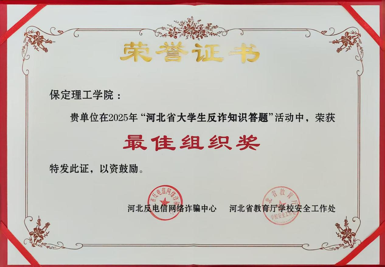 文章导读:近日,在2025年“河北省大学生反诈知识答题”活动中,我校凭借出色的组织工作显著的参与成效,在全省高校中脱颖而出,荣获“最佳组织奖”。本次活动由河北省公安厅、河北省教育厅联合主办,旨在全面提升大学生防范电信网络......