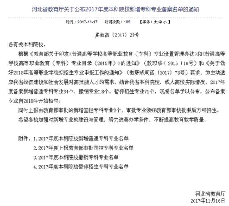 文章导读:省教育厅近日公布了2017年度本科院校新增专科专业备案名单,我校首次申报的会计、计算机应用技术、工程造价、电子商务、电气自动技术等五个专科专业全部通过教育厅审批备案。此次申报,依据《河北省教育厅关于做好2018......